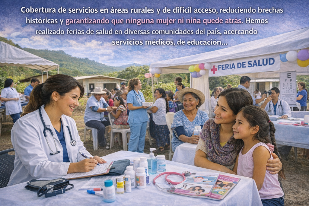 Y hablar de acción en salud significa pasar del discurso a los hechos. En este sentido, se continúa ampliando la cobertura de servicios en áreas rurales y de difícil acceso, reduciendo brechas históricas y garantizando que ninguna mujer ni niña quede atrás. Hemos realizado ferias de salud en diversas comunidades del país, acercando servicios médicos, de educación en salud y promoción de hábitos saludables a mujeres, niñas, y familias enteras.