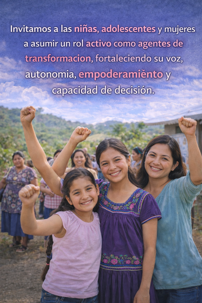Invitamos a las niñas, adolescentes y mujeres a asumir un rol activo como agentes de transformación, fortaleciendo su voz, autonomía, empoderamiento y capacidad de decisión.